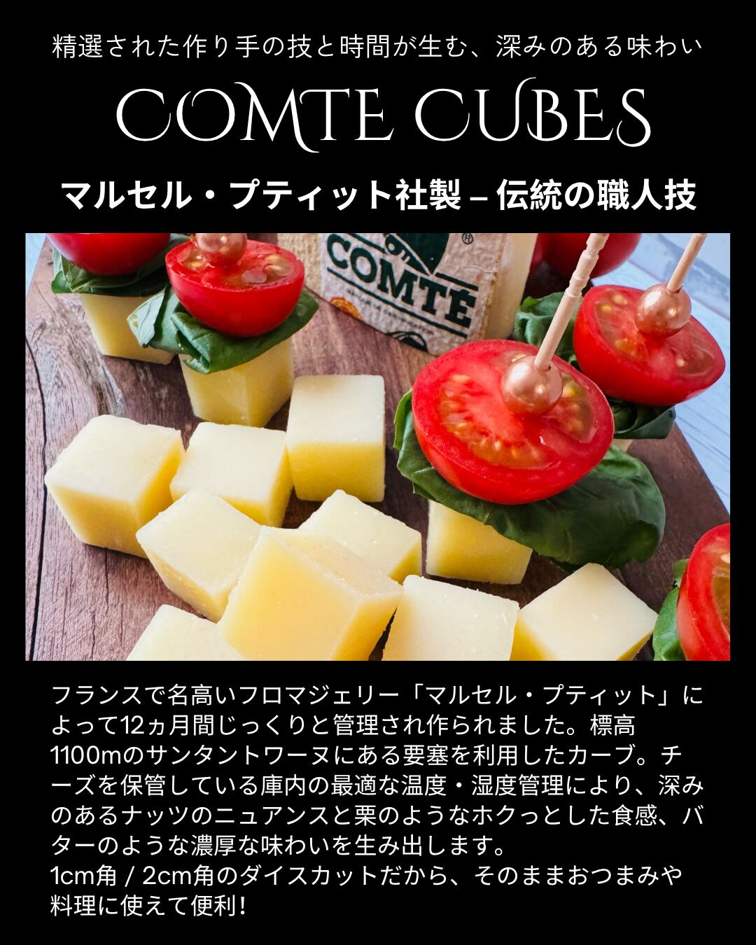 本チーズは、フランスで名高いフロマジェリー「マルセル・プティット」によって12ヵ月間じっくりと管理され作られました。標高1100mのサンタントワーヌにある要塞を利用したカーブ。チーズを保管している庫内の最適な温度・湿度管理により、深みのあるナッツのニュアンスと栗のようなホクっとした食感、バターのような濃厚な味わいを生み出します。