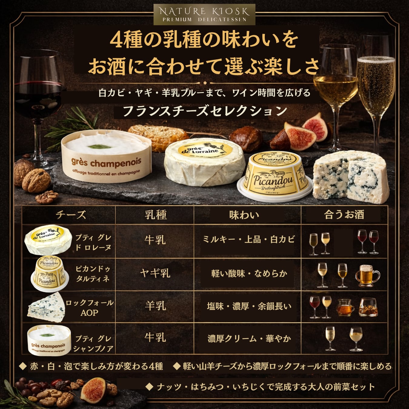 セットには、ミルキーで上品な白カビチーズ「プティ グレ ド ロレーヌ」、軽やかな酸味となめらかな口あたりのヤギチーズスプレッド「ピカンドゥ ア タルティネ」、羊乳の旨みと青カビの塩味が力強い「ロックフォールAOP」、濃厚クリームのコクが広がる「プティ グレ シャンプノア」を詰め合わせました。