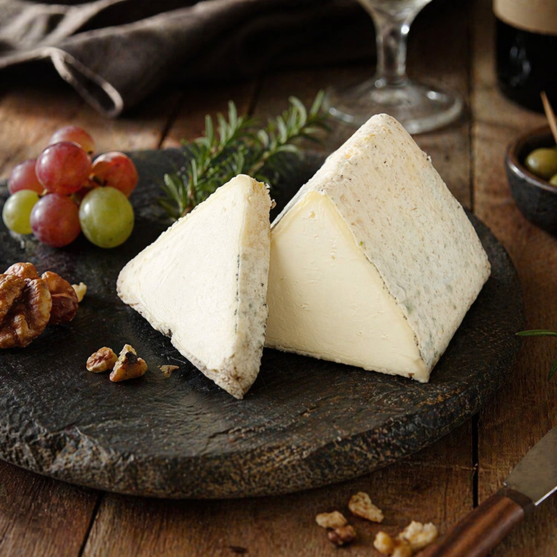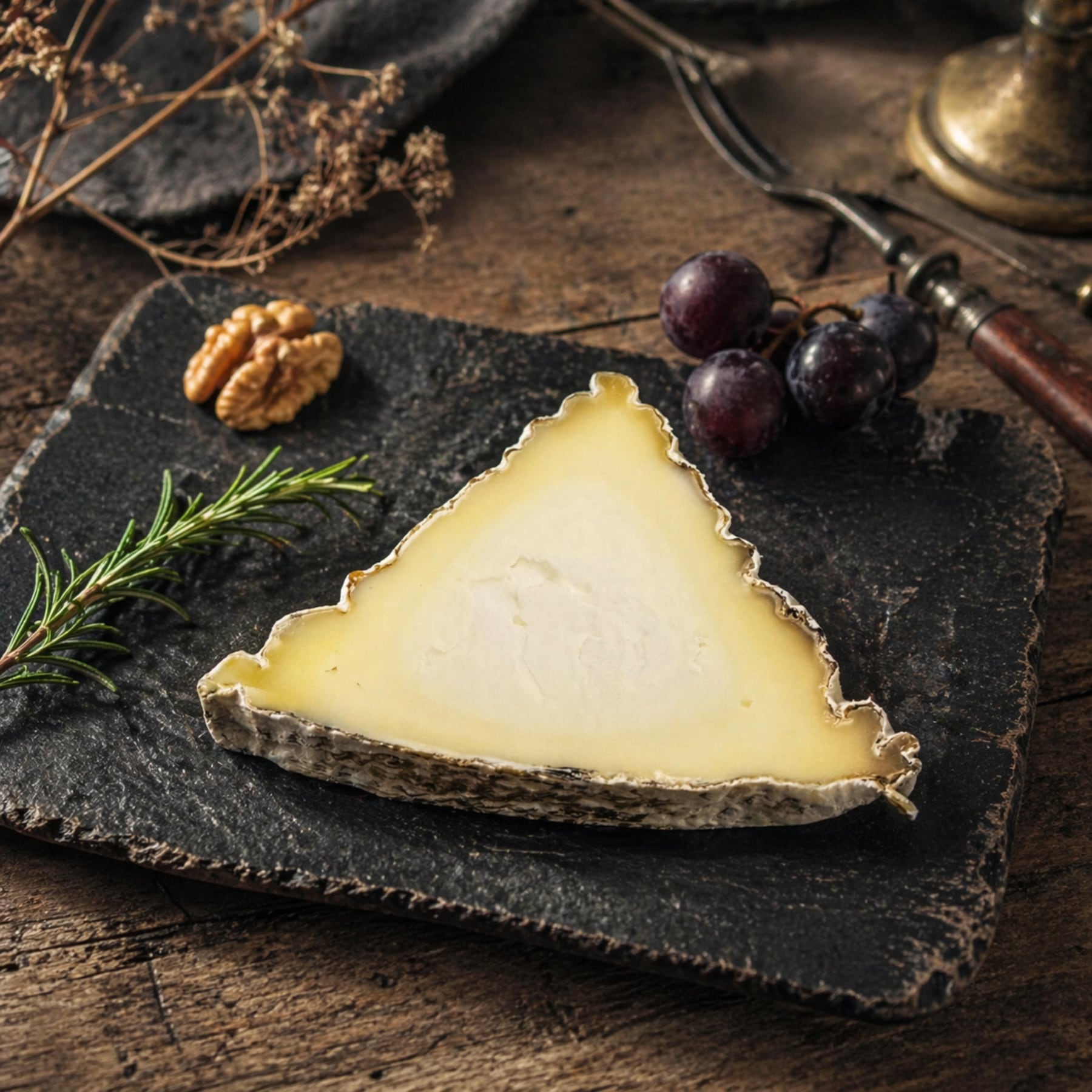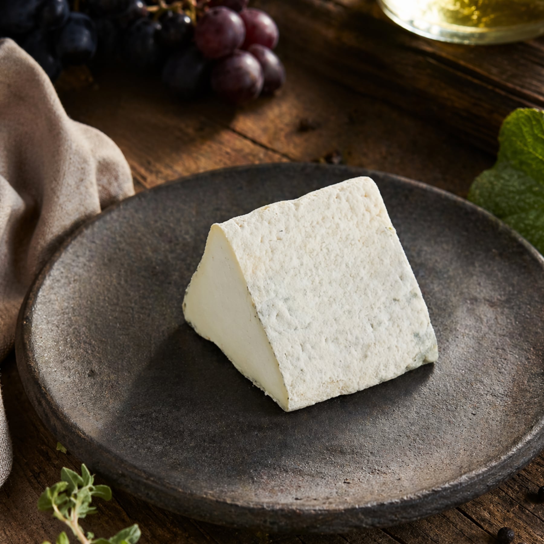【"灰色の塩"による神秘的な熟成】特製の塩が、チーズに深いミネラル味を付え、短期熟成ながら塩の浸透圧で山羊乳のうまみが凝縮。外は灰色がかった自然な皮、内側はクリーミーでなめらかな食感。