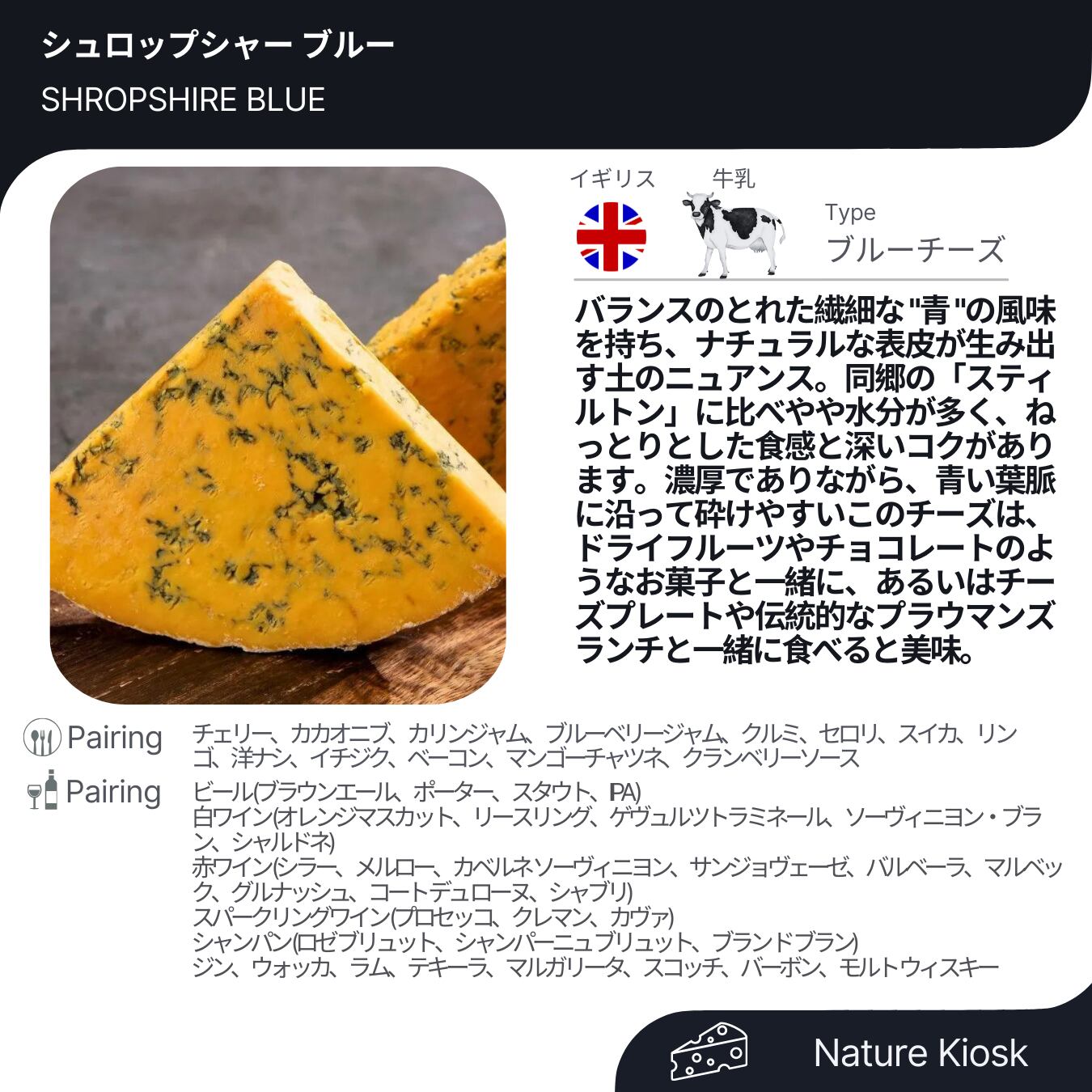 ✅【シュロップシャー ブルー(イギリス産)】鮮やかなオレンジ色の生地に広がる青かび、1981年に開発された『モダンブリティッシュチーズ』のひとつです。元々はブルースティルトンの修行を積んだチーズ職人によって作られたもので、このバリエーションはスティルトン好きを虜にすること間違いなし。かつてはサフランや人参で色付けをされていましたが、天然色素アナトー(ベニノキから抽出)が使われるようになったのは20世紀に入ってからです。バランスのとれた繊細な "青 "の風味を持ち、ナチュラルな表皮が生み出す土のニュアンス。同郷の「スティルトン」に比べやや水分が多く、ねっとりとした食感と深いコクがあります。●原材料名:生乳、食塩 / 着色料(アナトー)、(一部に乳成分を含む)